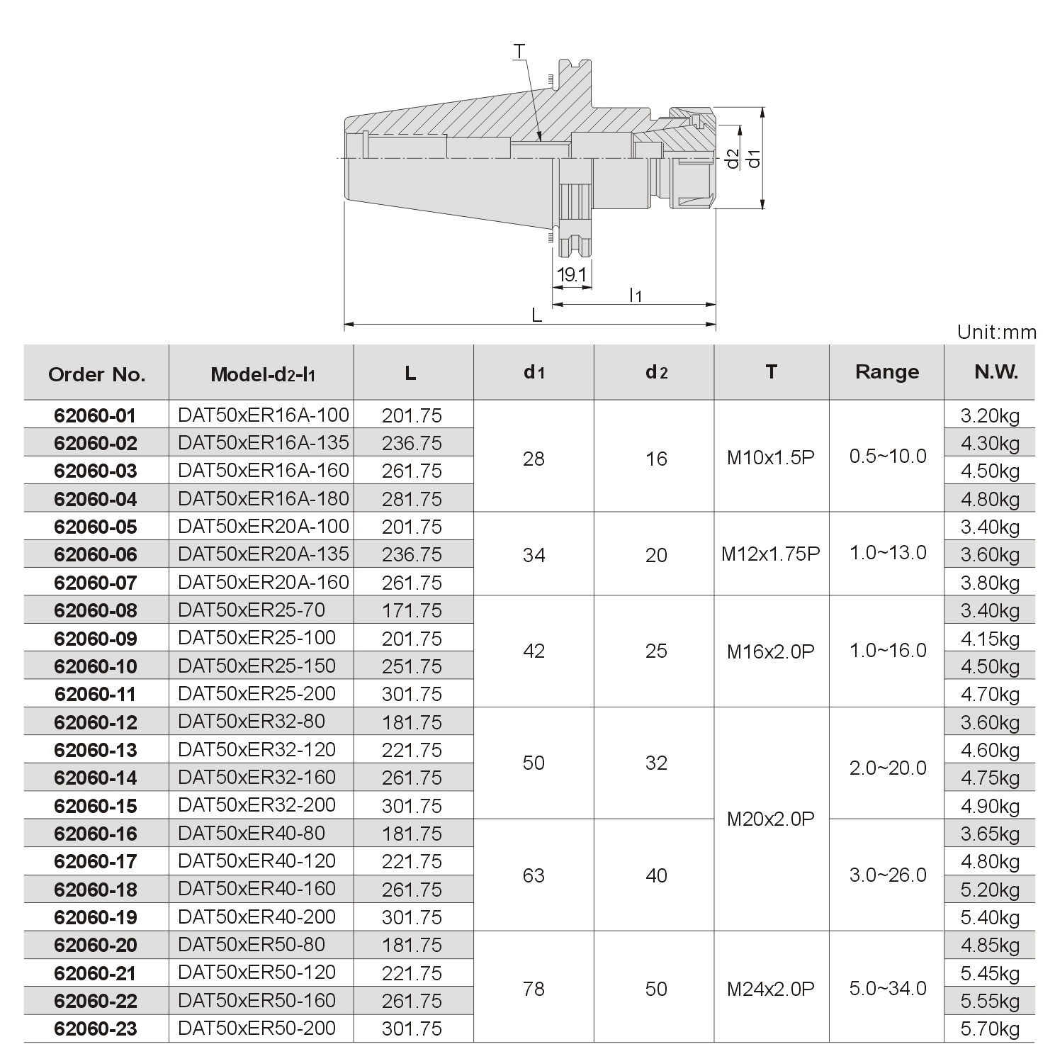 ► ER25, ER32, ER40, ER50 comes with a standard nut.